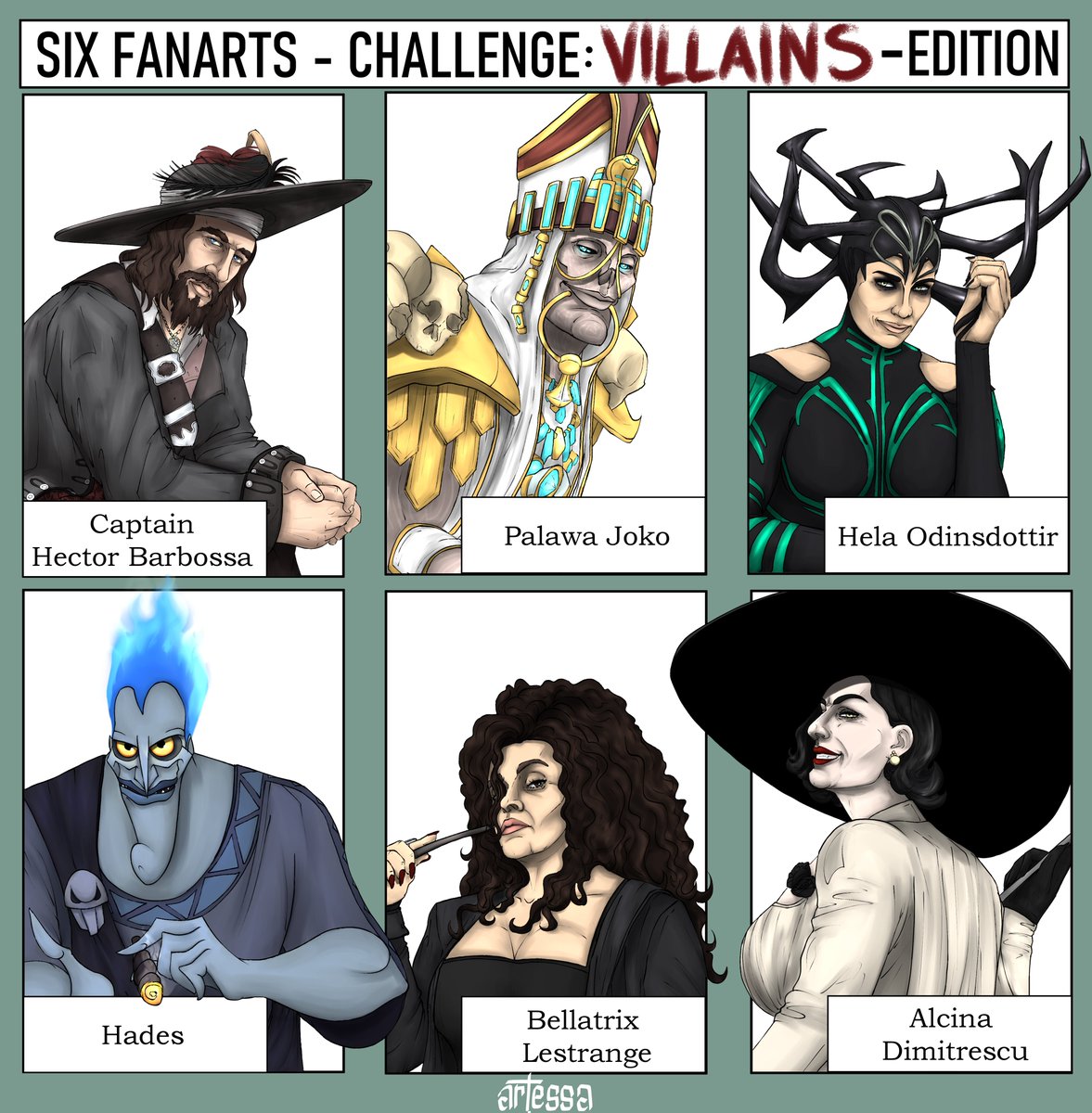 "Don't worry, stranger. Come join us, the game has just started ..." It's done. I drew my fav villains playing poker together. Boom. #joko #LadyDimitrescu #hades #hela #lestrange #barbossa #SixFanartsChallenge #SixFanarts