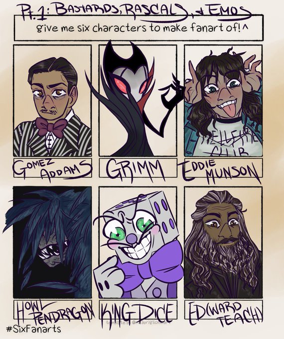 my first #SixFanarts challenge! plan on doing more of these as chill droobles intermittently bw big pieces~ feel free to drop more characters, i'm keeping a list!