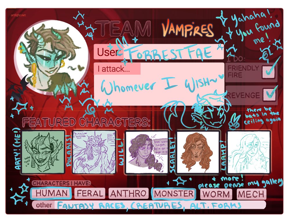 WHOOOOOO'S READY TO RUMBLEEEEEEE getting hyped for #artfight2023 babyyyyyy (the only reason i'm team vamp is cause i have 2 new vamp OCs who need love) find me on artfight as @/forrestfae !! #teamvampire #artfight