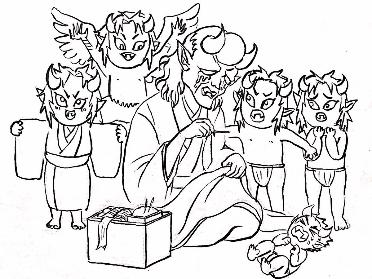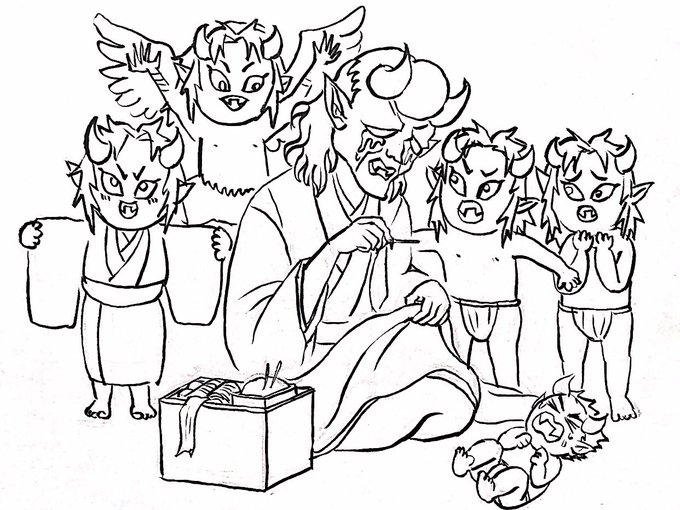 66 329 #鬼さん深夜の60分一本勝負 @oni1draw1write お題:半天狗/着物 みんなの着物を縫うおじいちゃん 左/1時間 右/+1時間45分 20/05/29 22:26
