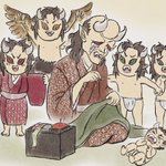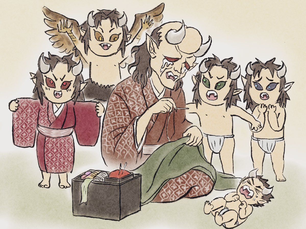 #鬼さん深夜の60分一本勝負 @oni1draw1write お題:半天狗/着物 みんなの着物を縫うおじいちゃん 左/1時間 右/+1時間45分