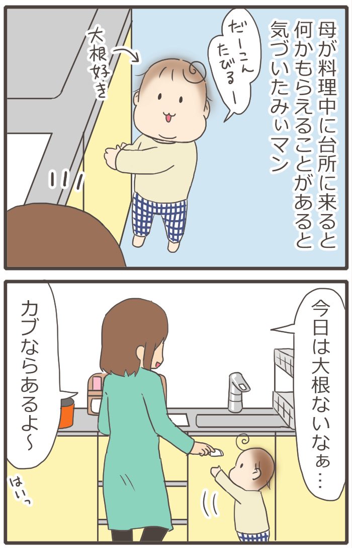 1 0 ちなみに今は大根食べなくなりました(偏食期) #漫画が読めるハッシュタグ #四コマ漫画 #子育て漫画 #育児漫画 #育児絵日記 #エッセイ漫画 22/11/10 18:19