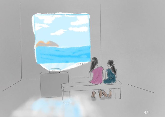 0 8 今日の景色。「a little girl」というタイトルの音楽と映像作品、それを最前列でじっと見る姉妹らしき女の子たち。 #illustration #illustrator #zmi #girl #イラスト #イラストレーター #姉妹 #美術館 22/07/18 22:48