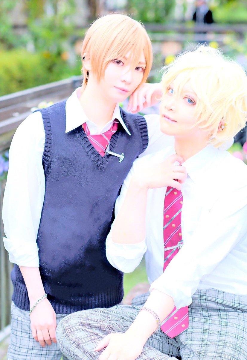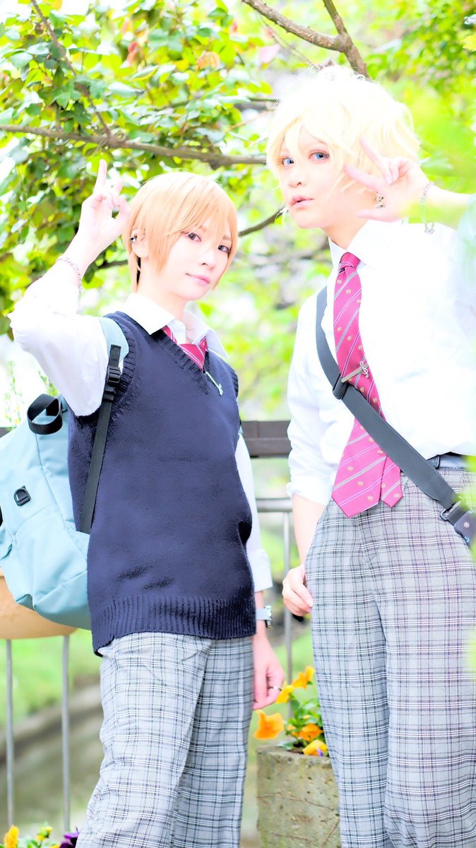 3 8 創作男子高校生って夢が広がる………🤤 イヤーカフもお揃っちなのだ!!随所にニコイチおそろっちがあってなかよしぴゃんで可愛かろう⁉️←自分で言っちゃう クロトさんが青春キラキラに撮影して下さって感謝しかない😭✨✨ 茶髪のかわいこちゃん…さくさん 金髪天パ…朝子 photo クロトさん #cosplay 23/04/26 19:41