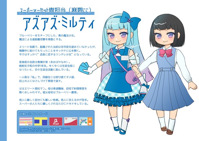担当…魔法少女 拠点…スーパーマーケット キャラ名…アズアズ•ミルティ ブルーベリーをモチーフにした、青の魔法少女。ポイントカードを模した魔法のカードを使って遠距離から戦います。 #絵師が本気でボードゲームを作る企画 ↓企画詳細はこちら↓ @MUGENProject_R4