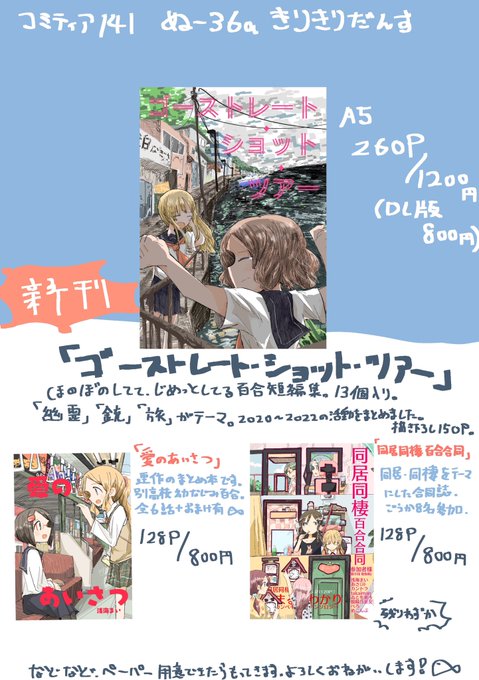 コミティア新刊の宣伝です! ほのぼのした雰囲気の百合漫画の短編がたくさん詰まった短編集になってます! 260P / 1200円 じめっとした短編や明るめの短編も入ってて楽しい本になってますので、是非お立ち寄りください! 「ぬ-36a きりきりだんす」です!🐟#コミティア141 #COMITIA141