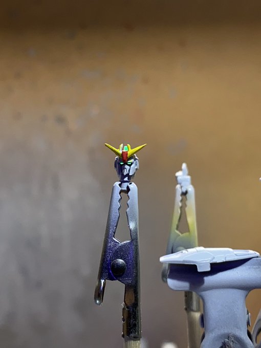 GUNDAM ARTIFACT PHASE2 V2アサルトバスターガンダム 顔の塗装は峠を越えました✌️ 赤いクマドリを塗るの忘れてて最後に慌ててクマドリを塗りました😅 あとは、楽しく筆塗りしていきましょー 老眼にはこの細かさはキツイ😓 #ガンダムアーティファクト2 #ガンプラ #食玩