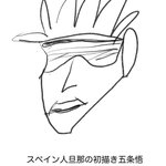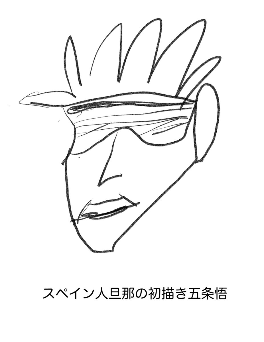 人間はこうやって描けばいいんだよ、とスペイン旦那に教えるために私も五条悟描いてみました。(※旦那の絵参照) 正直、輪郭と髪の毛と目隠しと鼻と口さえ描けば難しくないだろ!と思ってたんですけど難しいわこの人。 #呪術廻戦ファンアート