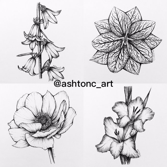 Inktober Days 13 - 16 😎🖋 💐🌸🌺🌼🌻🌷🌹 #inktober #inktober2020 #bellflower #balloonflower #anemone #gladiolus #flowers