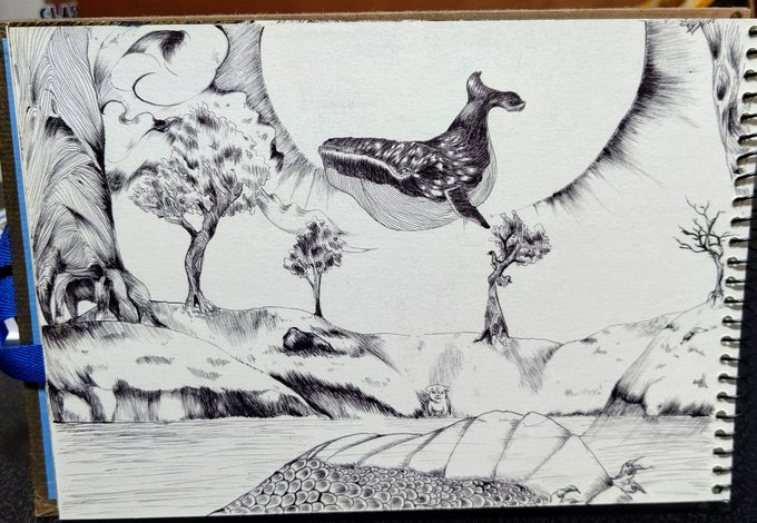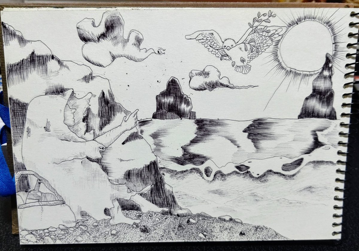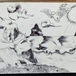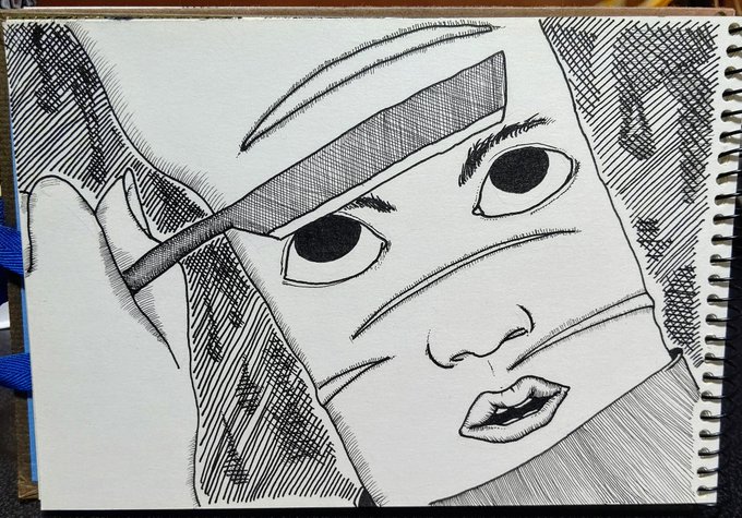 統合失調症の症状の1つ。幻視。 干しかけの洗濯物の1コマを絵にしてみました。 色んなものが見えますが、僕に見えるのは白い布をかぶった小さな人です。 何か意味があるのかな? #統合失調症 #ペン画 #絵描きさんと繋がりたい #過去絵を投げて絵を描いた気になろうキャンペーン