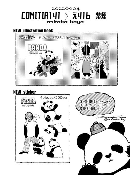 明日、、、というかもう今日のお品書き!! COMTIA141【え41b】にて出展いたします〜!良かったら遊びにきてね🐼 パンダたくさん描いた 原画、色紙も持ってくよ #COMTIA141 #COMITIA #お品書き