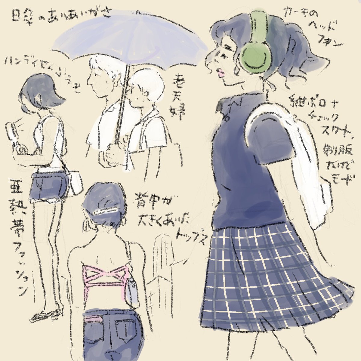 東京の夏のスケッチ☀️ ●高校生の制服がポロシャツなの涼しげでいいね ●日傘の相合傘カップルを何組か見た ●ハンディ扇風機の普及率 ●男女とも「ビーチか」くらい露出度が高まってる #illustration #イラスト