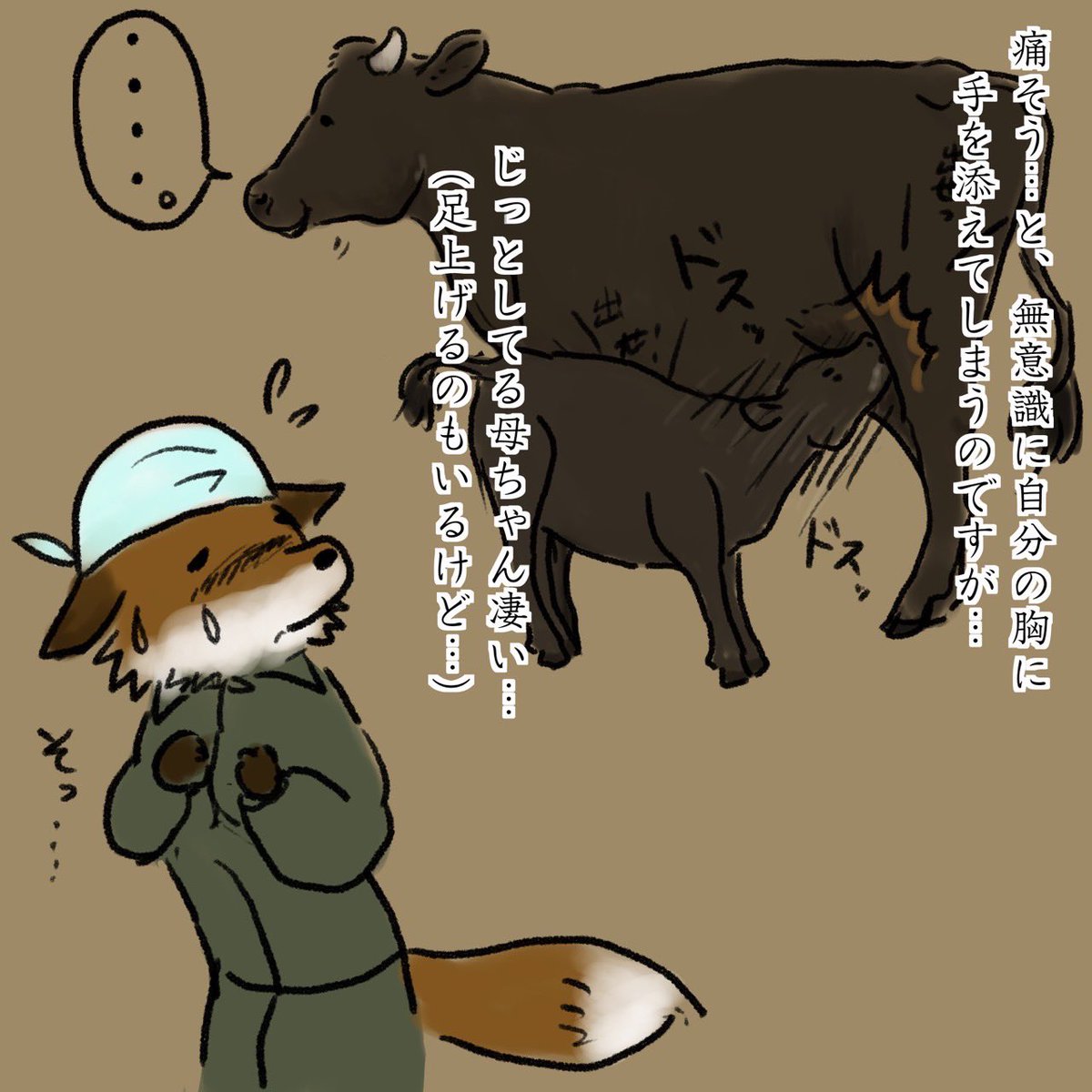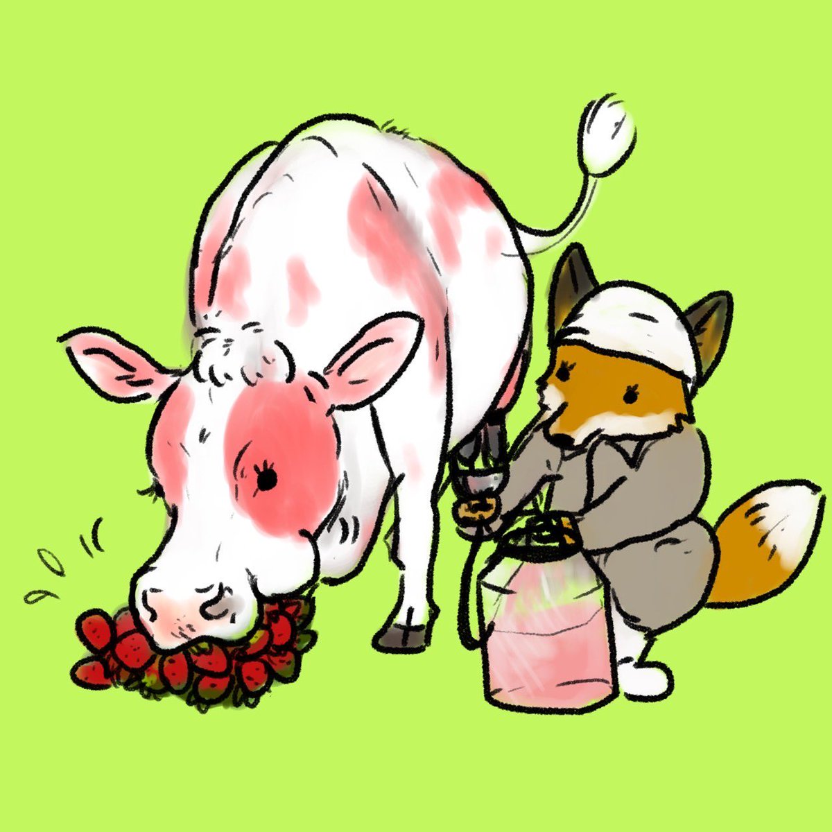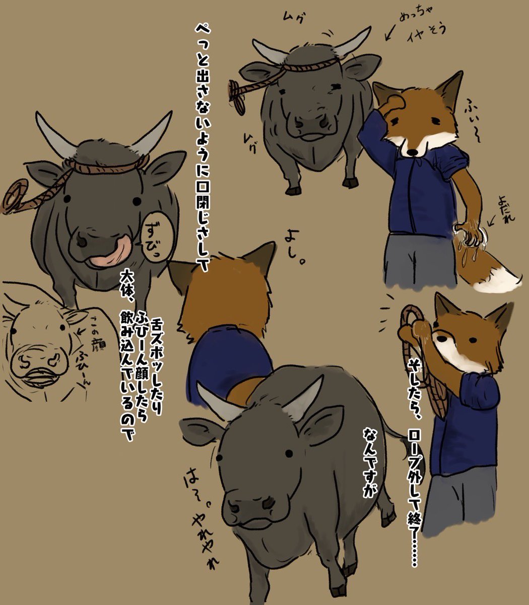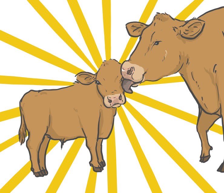 レレレのおじさんみたいに、ホウキを持って掃除するブラウンスイス牛 (@kraut1220 さんのリクエスト) #牛イラストリクエスト #牛乳月間 twitter.com/askaichigomow/…