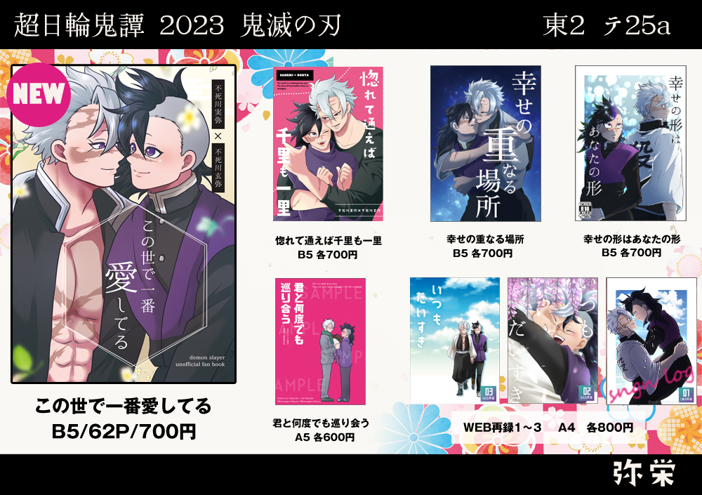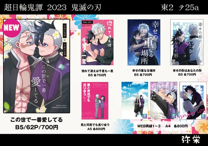 18 61 5/4 超日輪鬼譚2023のお品書きです!新刊1種、既刊を持って行きます~!全てさねげんです。 当日はどうぞ宜しくお願いします🍃🍉 23/04/29 12:00
