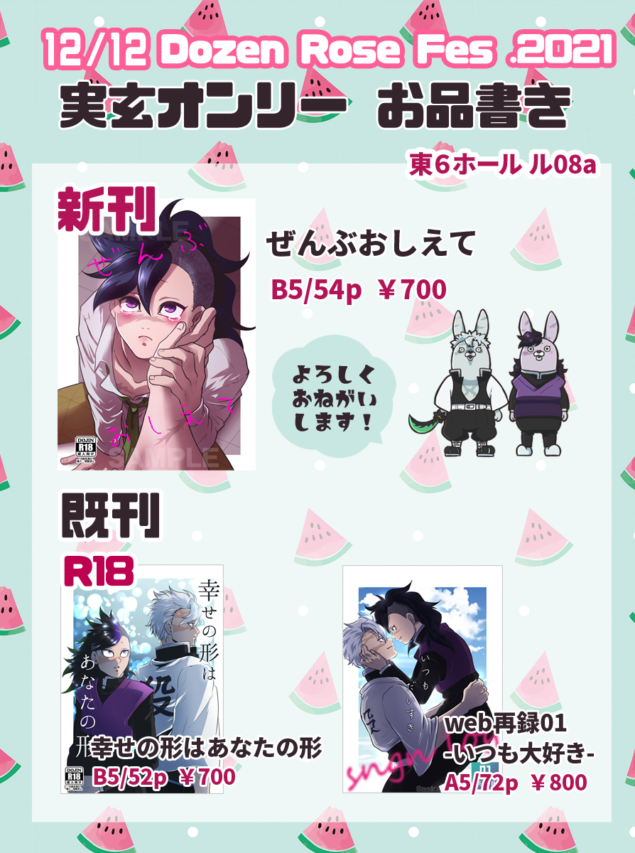 7 93 12/12 🍃🍉実玄オンリーお品書き 東6ホール ル08a 新刊1冊、既刊2冊もっていきます! 宜しくお願いします! 21/12/07 22:11