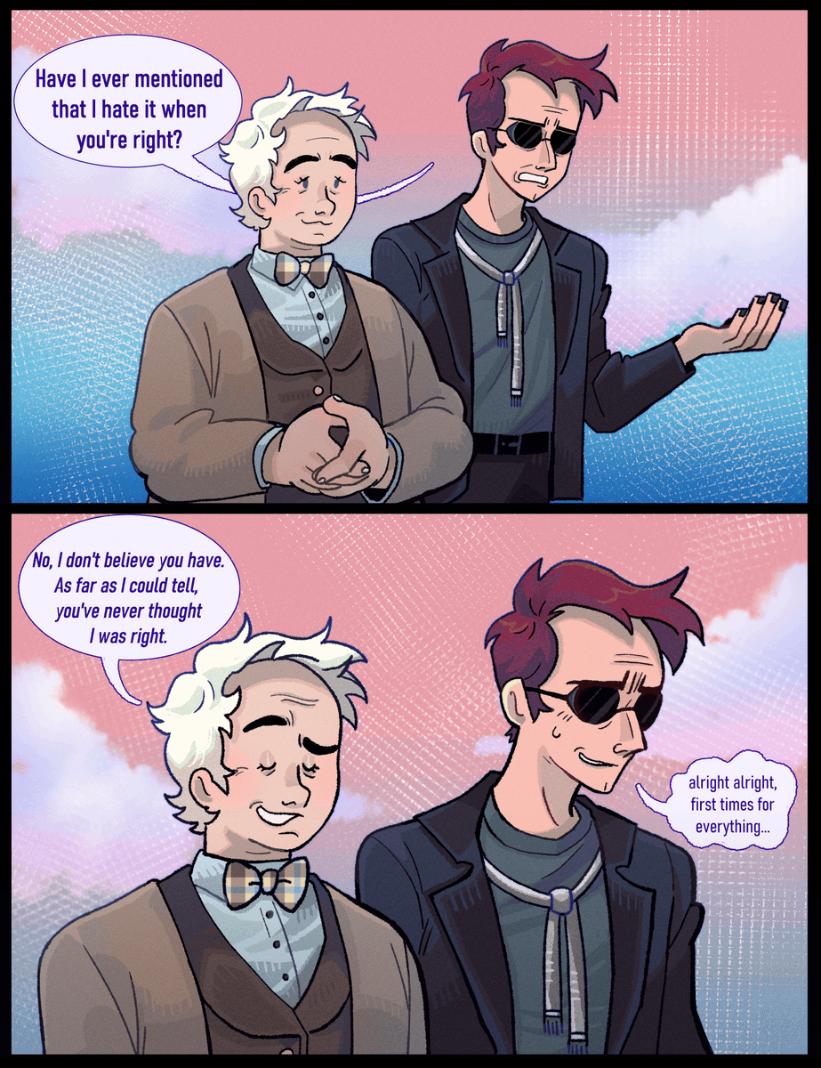 heres a sketchy good omens comic. lord knows crowley isnt going to let him run back in there, and azi's a bit too exhausted to fight him on it. #GoodOmensFanArt #goodomens
