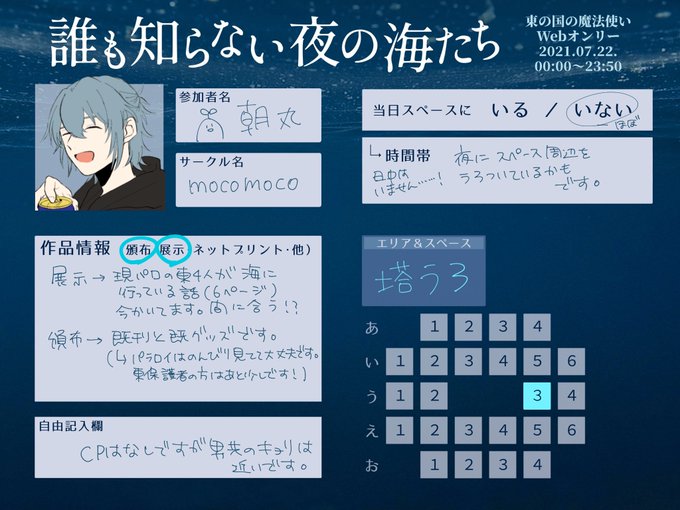 7/22「誰も知らない夜の海たち」 【塔う3】でスペースいただいてます。 展示漫画は今描いてます!!!!がんばります! あとは気力があれば過去絵をネップリ登録するかもです。 #東オンリー0722_サークル情報