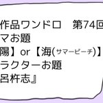 明日の開催予告です! <#麻生作品ワンドロ 第74回> 日時: 7/17(土) 21:00〜22:00 お題: 画像の3つから選んでください。 開始時間まで前回のお題で作品投稿可能です。 皆様のご参加をお待ちしております!
