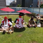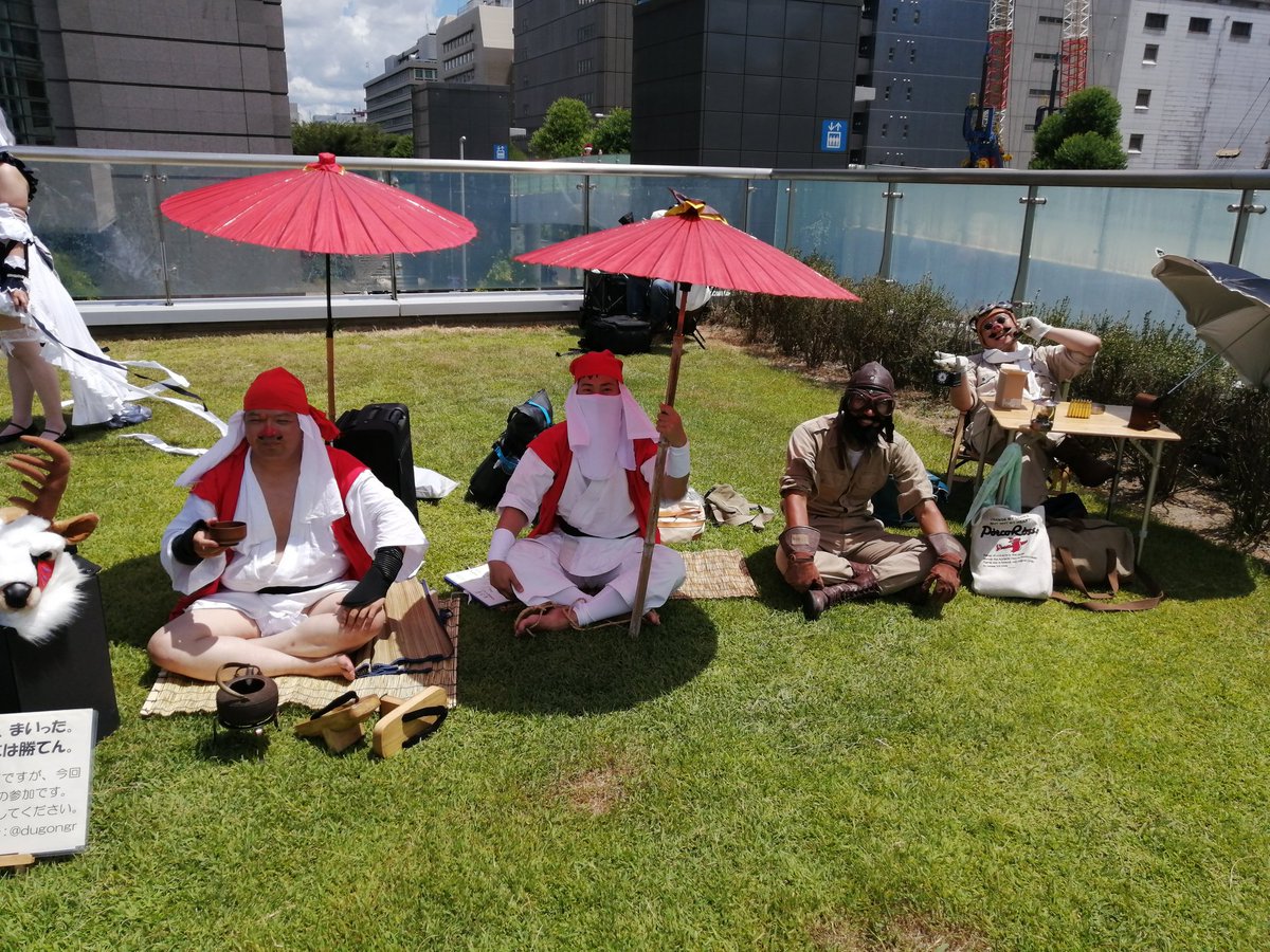 #富士コス ロボット兵、あまりもの大きさのため出入り口のテントを通過できず 横のポールを外してもらい通してもらい、人間に感謝の意を表す