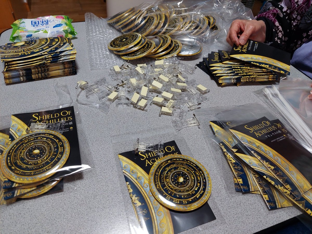 「アキレウスの盾」缶バッジ、心を込めて封入作業いたしました。(助っ人に母) 普段はイベント会場のみでの販売ですが、古代ギリシャナイト支援者限定で、約一ヶ月特別WEB販売しております!この機会に是非! twitter.com/ELLENIKE_NYX/s… #ヘルメスラジオ #古代ギリシャナイト