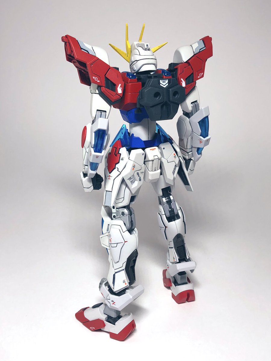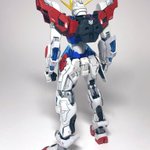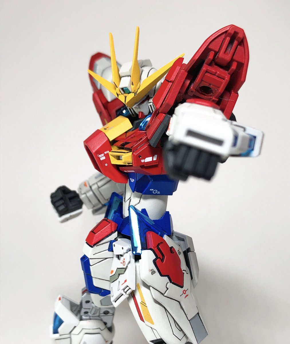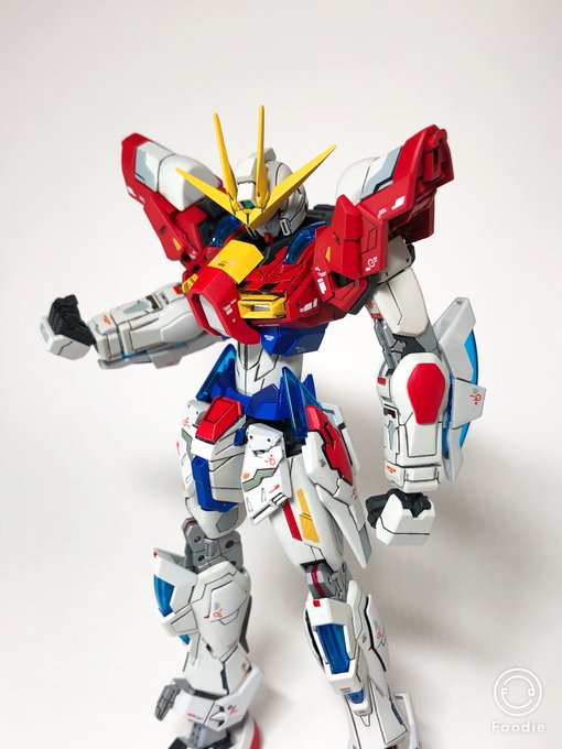 RGビルドバーニングガンダム 完成しました。 RGフレームを一部そのまま流用しながら、アニメの綺麗なトリコロール色と、腹筋を意識して制作しました。 伸びた腹部に合わせて両腕延長してます(╹◡╹) #ガンプラ #ガンプラの画像貼るとRTされると聞いて
