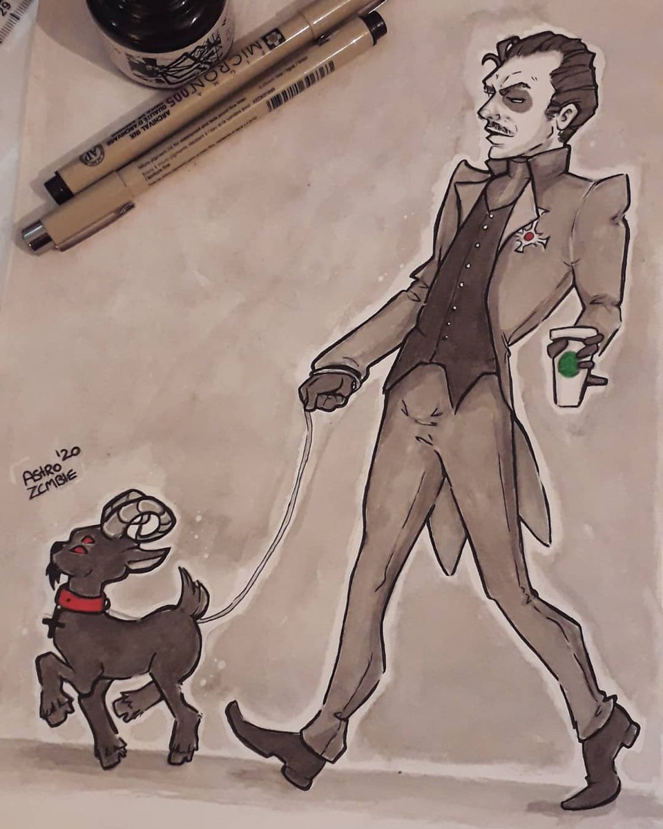 Sometimes you gotta walk your Satanic goat while you grab coffee....I feel like Copia is a pumpkin spice kinda guy #cardinalcopia #GHOST #thebandghost #Inktober #inktober2020
