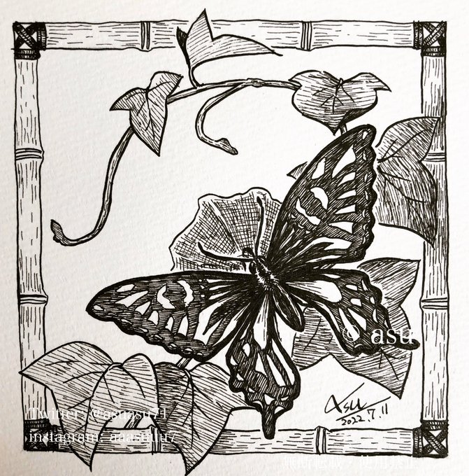 朝顔とアゲハ蝶 庭のレモンの木に産みつけられた卵を回収しては育てて羽化させています。成虫になったこの姿を見る度に、自然界が作り出す芸術を真似するのは難しい…と実感します。 #イラスト #絵 #ツイッターで楽しむ展覧会 #illustration #art