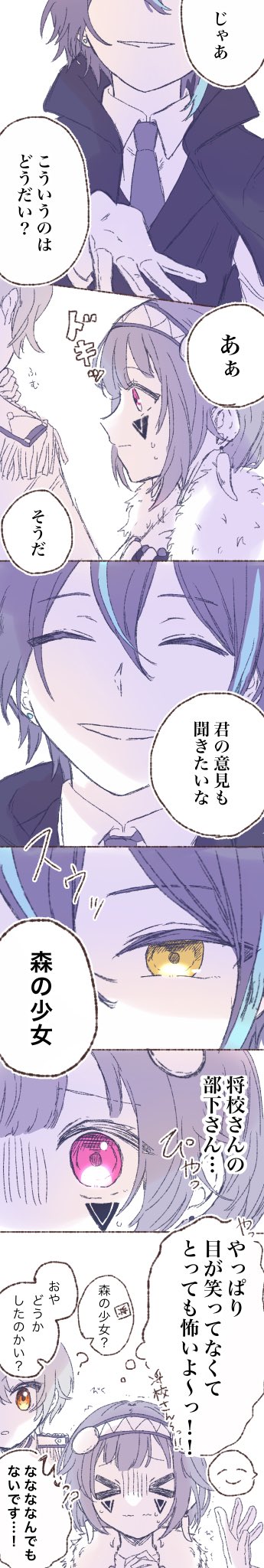 11 47 #prsk_FA リバドリの大臣の部下と森の少女の妄想漫画 森の少女がえむちゃんみたいに人の感情に対して敏感だったらっていう…呼び方は捏造です。 22/10/07 08:52
