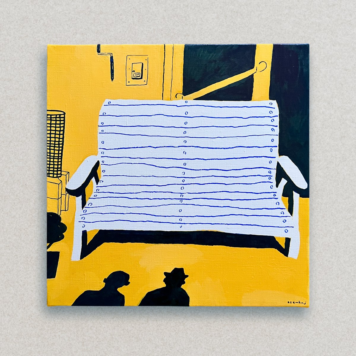 \展示のお知らせ/ 今日から始まりました「みんなだいすき和田誠」展なるグループ展に参加しています。(10月11日まで。神保町、ブックハウスカフェ ギャラリーひふみ) イラストレーションにデザインに憧れだった和田さん。 僕が唯一持てた接点であった、HBギャラリーの白いベンチを描きました。 twitter.com/TISjimukyoku/s…