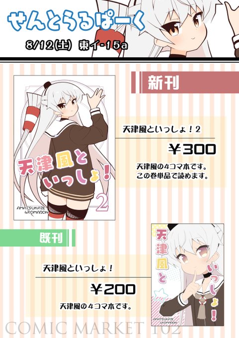 【C102 夏コミ 新刊】 天津風といっしょ!2 天津風の4コマ本です。新作+今までのまとめ少し的な内容です。 単巻読み切りなので2巻からでもお読みになれます! よろしくお願いします~ 1日目(土) 東イ-15a 「せんとらるぱーく」 18p/B5/¥300予定 #C102