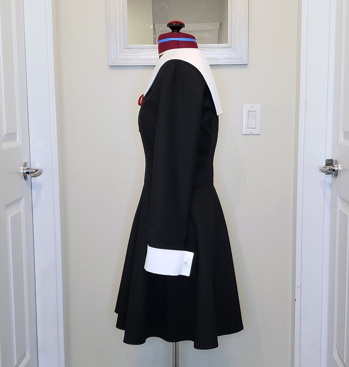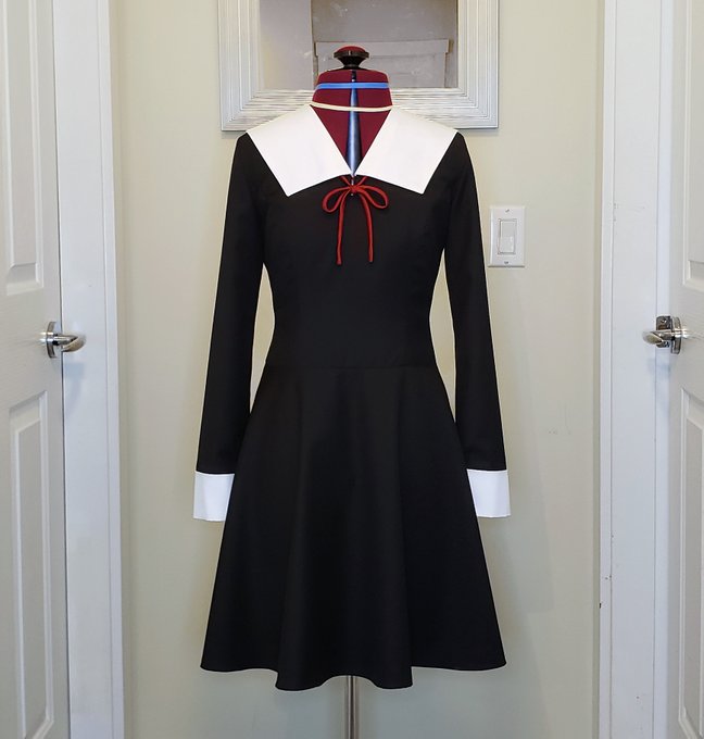 Finished Kaguya-sama uniform dress! Bust is 34.5" and waist is 26.5". Dress is black mystery cashmere (?) blend + mystery polyester lining w/ white lightweight gabardine from @charanuno. Ribbon is matte satin. #キャラヌノで作ってみた