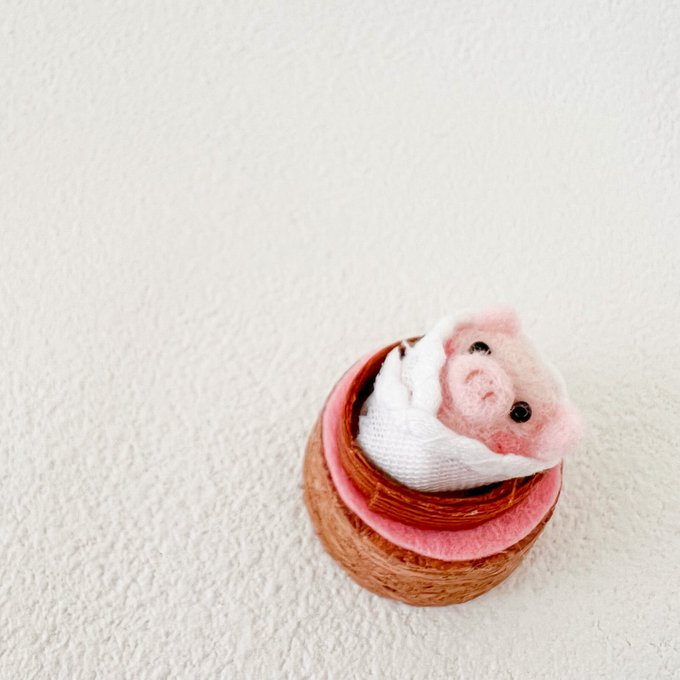 今度はぶたちゃん👶💕 おくるみに包まれて、気持ちよさそう☺️ #ハンドメイド #handmade #羊毛フェルト #ミニチュア #needlefelting #miniature #ハンドメイド好きさんと繋がりたい