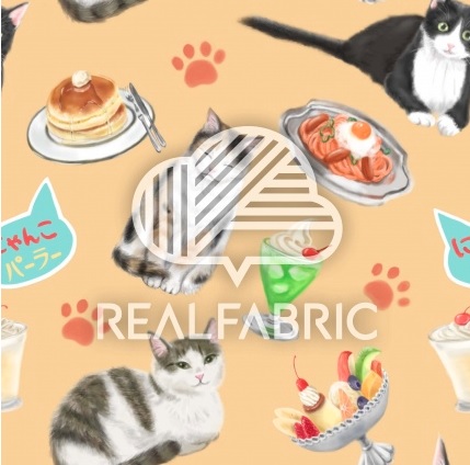 〈カフェネコ~昭和レトロなにゃんこパーラー(イエロー)〉 昭和レトロなメニューとにゃんこを散りばめた生地です🥞🥤🍝😺🎵💕 realfabric.jp/view.php?num=3… #リアルファブリック #布 #生地 #ファブリック #可愛い布 #猫イラスト #猫 #猫柄 #猫好きさんと繋がりたい