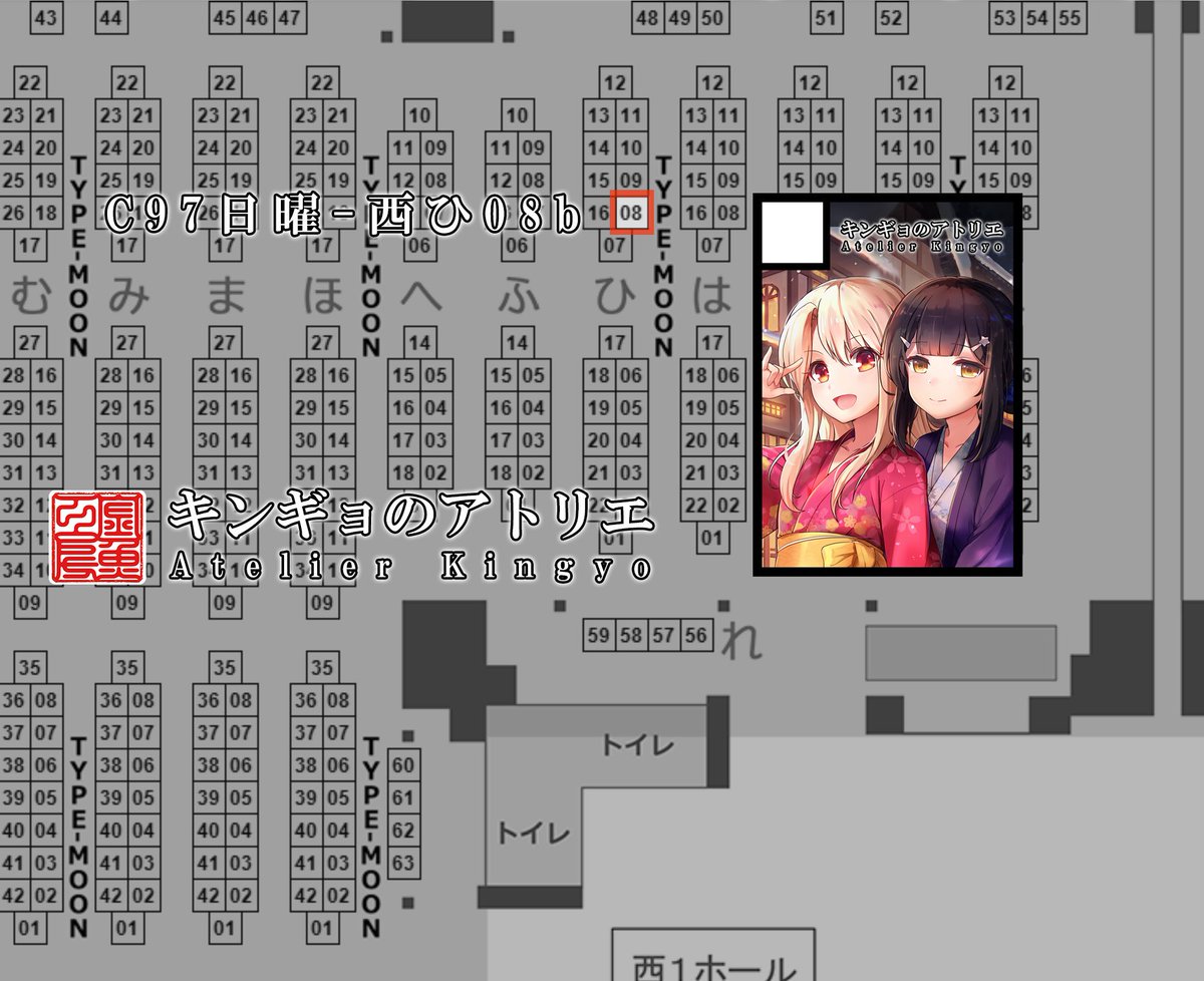 サークル「キンギョのアトリエ」は、コミックマーケット97で「日曜日西地区 "ひ " 08b」に配置されました! 今回は新作のグッズを用意する予定です、よろしくお願いします~ webcatalog.circle.ms/Circle/Map/148… #C97WebCatalog #プリズマイリヤ