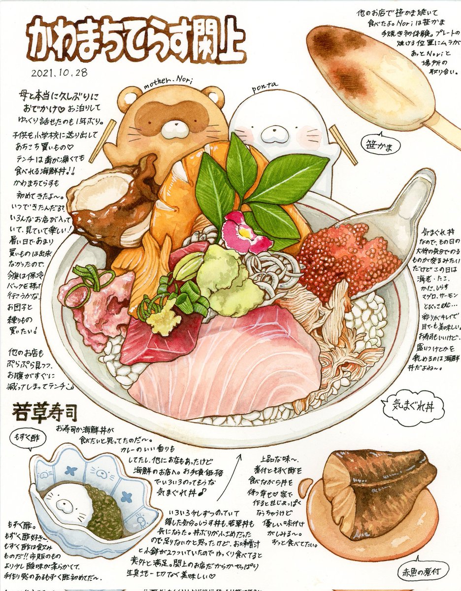 2 29 母とお出かけ✨ 母は介護職なので、ずっと外出などの制限が厳しかったんですが、私のワクチン接種も無事に終わって、久しぶりにゆっくり会うことができました(*Ü*)💕 美味しいものいっぱい買えて&食べれて幸せ💓 #透明水彩 #食べ物イラスト 21/11/12 11:08
