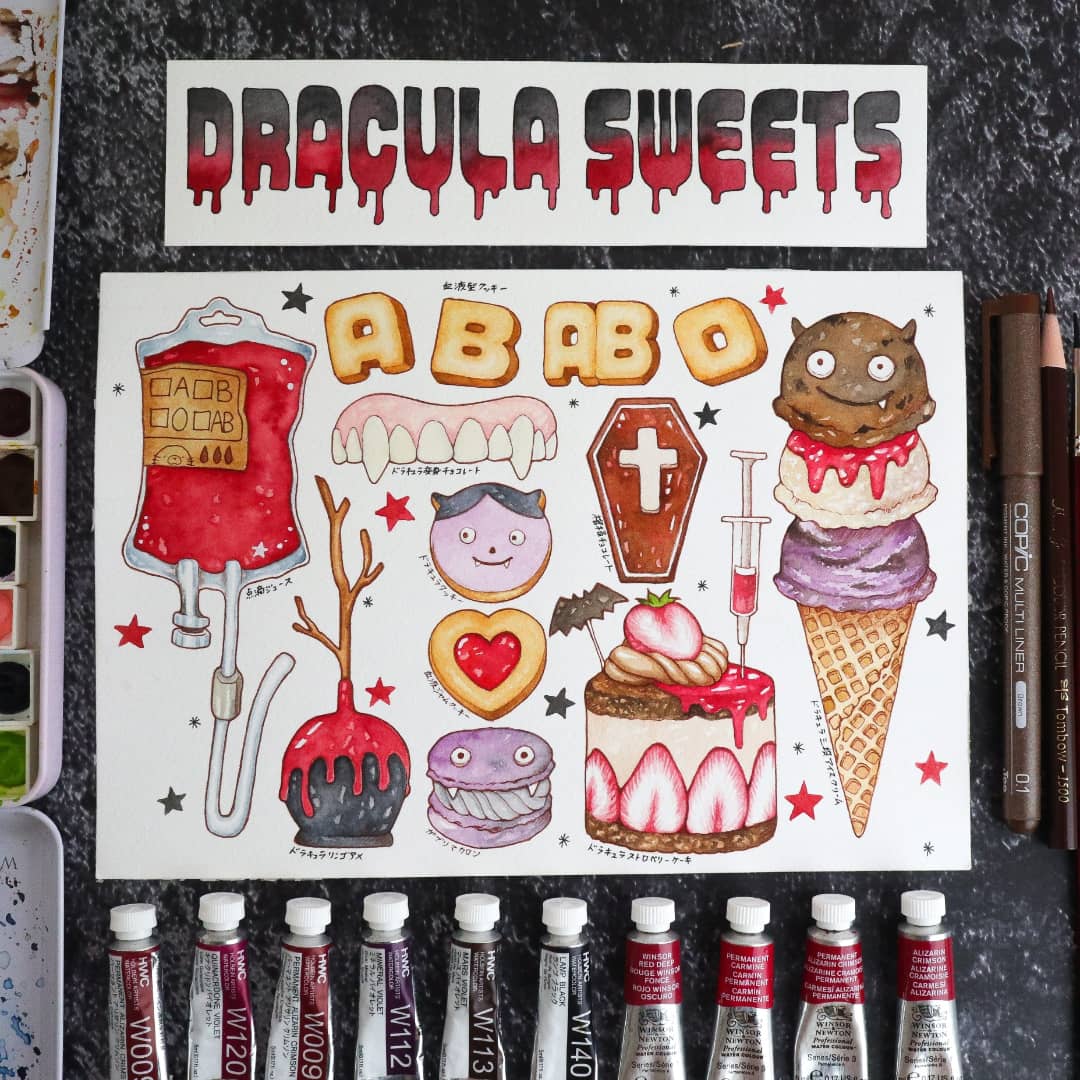 Happy Halloween🎃✨ ドラキュラさんのお菓子♥ #食べ物イラスト #透明水彩