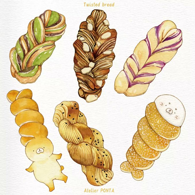 ツイストパン🍞✨ いろんな味のいろんな色のネジネジされたパン可愛いです❤ 昔ながらの揚げてあってお砂糖がまぶしてある、シュガーツイスト… ハイカロリーへの背徳感と、お砂糖をボロボロこぼしながら食べる罪悪感が最高…💖…だっだりする…笑 #イラスト