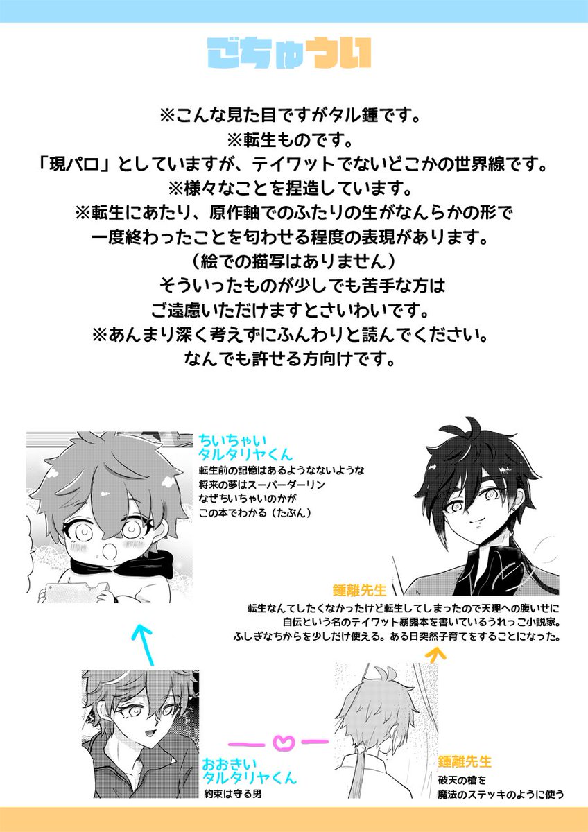 12 105 新刊サンプル(2/3) ⚠️転生・現パロ・幼児化⚠️の要素を含みます #タル鍾 22/04/26 22:52