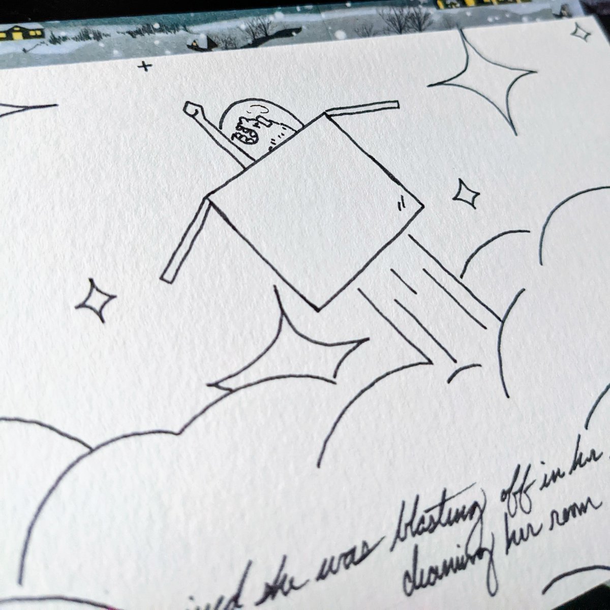 Molly imagined she was blasting off in her spaceship instead of cleaning her room... #illustration #illustrationartist #illustrator #kidlit #kidlitart #kids #imagination #spaceship #space #astronaut #peachtober22 #mollyneedstocleanherroom