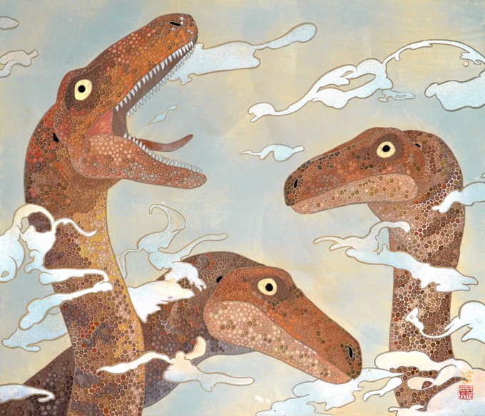 そこそこ埋まっている時と最後の一個を埋めた時とで全然見え方変わるんですよね。 #日本画 #恐竜 #wip