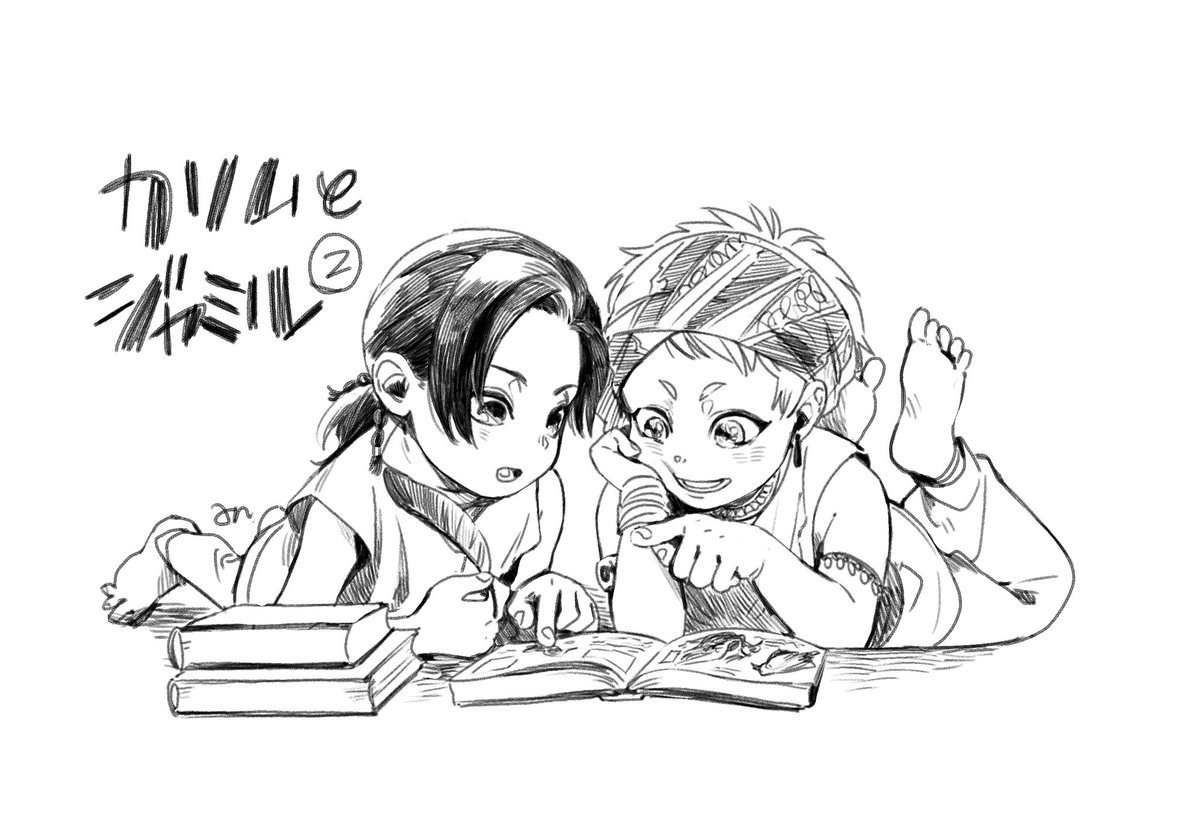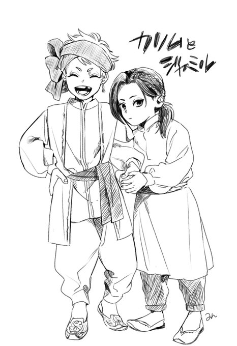 前ツイでコメント間違えたから幼児時もこさえた🤭 幼児時のカリムは王族らしくむっちり、ジャミルは従者だからガリかな…という捏造スカラビア主従ちゃん🧞♂️🧞 #ツイステ #ツイステファンアート