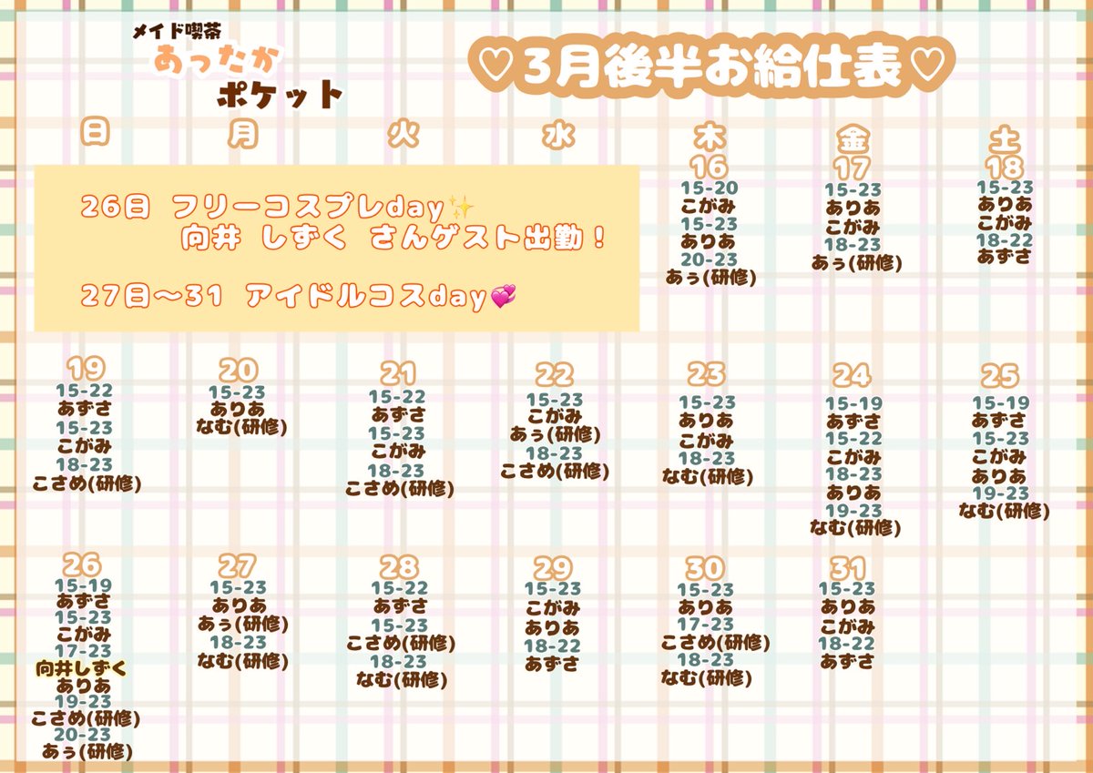 3月後半のお給仕表になります❣ 26日向井しずくさんゲスト&フリーコスプレday、27~31日はアイドルコスdayです👚