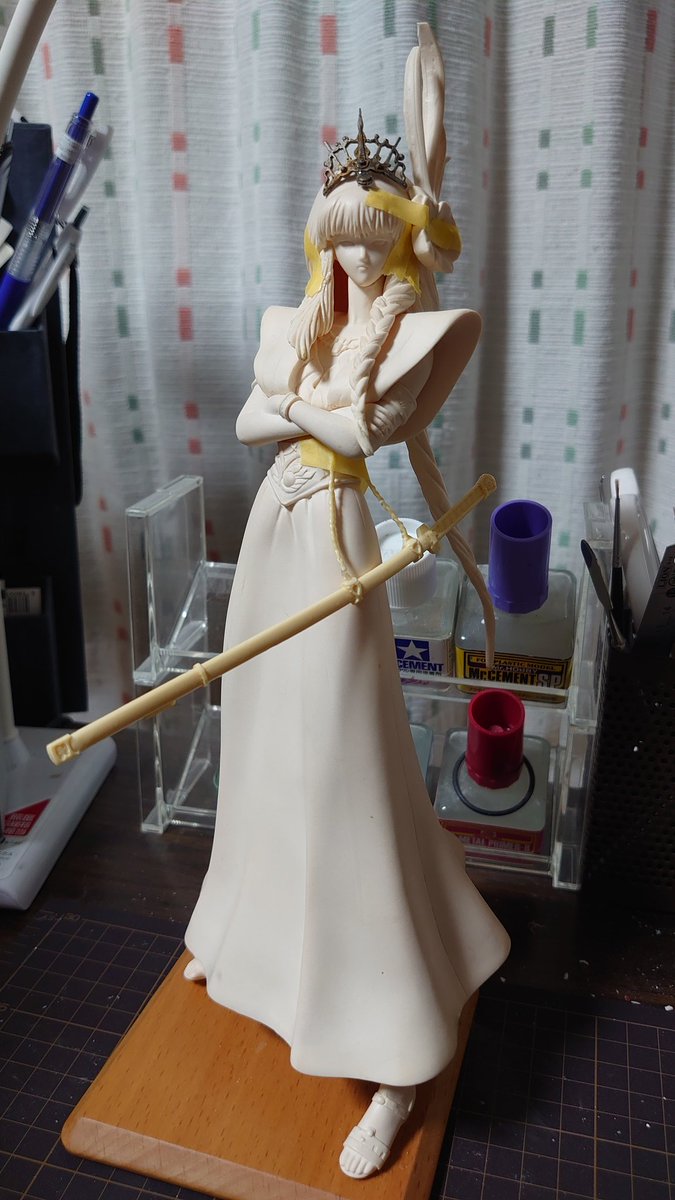昨日、付けていなかった冠&太刀を仮組みしてみましたw デザインズでは乙種2等正装となっているけど普段着的な服装なのかな? ラキシスとヤクト組立て工房シーン、ルンとのラキシスの落書きトーク、リィとのLED組立て工房でのシーンなどで見る服装なので #FSS_jp