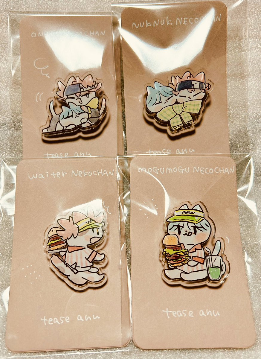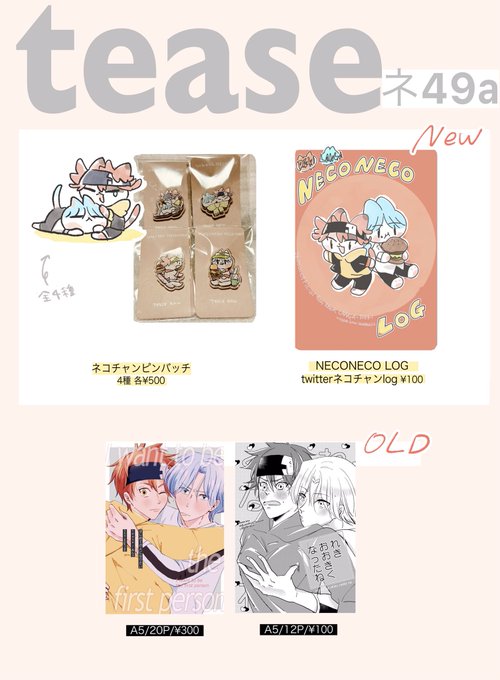 2/12 OTGお品書き tease ネ49a ネコチャンピンバッチとtwitterネコチャンログ本、あとは既刊本があります。ネコチャンだらけですが、よろしくお願いします🙇♀️