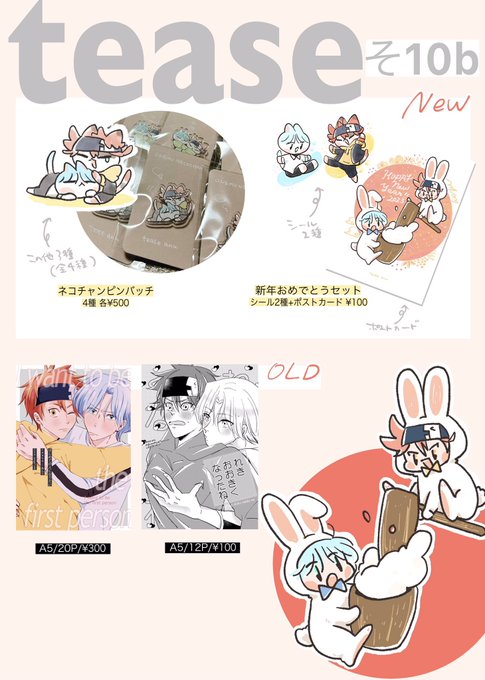 1/8 インテお品書きです🐰 新刊はありませんが、ネコチャンピンバッジと新年おめでとうセット(シール2種+ポストカード)を持っていきます。 ピンバッジは4種、画像2枚目を参照ください🐈 既刊は9月に頒布したものです。 よろしくお願いします🎍