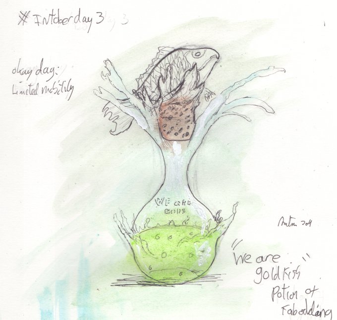 definatly wanna go back to this one proper #crinktober day 3 potions this potion of forbboding will turn user into goldfish if they fall more than 30ft. works for 24hrs #CriticalRole #Inktober #criticalrolefanart okay day today limited mobility shocked ive made it 3 days