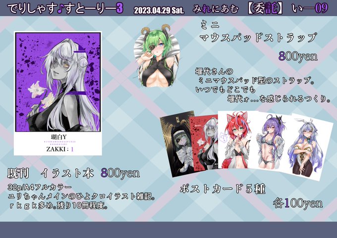 【お品書き】 4/29『でりしゃす🎶ストーリー3』 からたさんのサークルで委託させていただくことになりました。 内容は冬コミ+αといった感じです。全体的に部数が少ないのでおまけ程度に見てやってください。 よろしくお願いします……!! #ななしいんくオンリー twitter.com/krt294/status/…