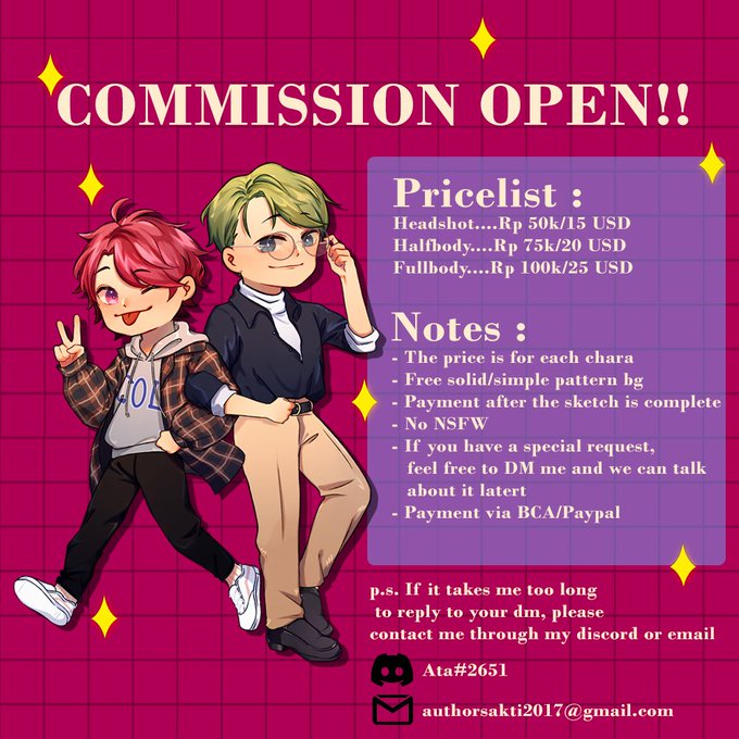 [RT and Share are really appreciated!] Halo! Aku buka commission lagi untuk 3 slot! Ketentuannya bisa dibaca dibawaah Jika ada yang ingin ditanyakan, silahkan dm aku! Thank you XD #commissionsopen #artidn @CmsnArtist_Id