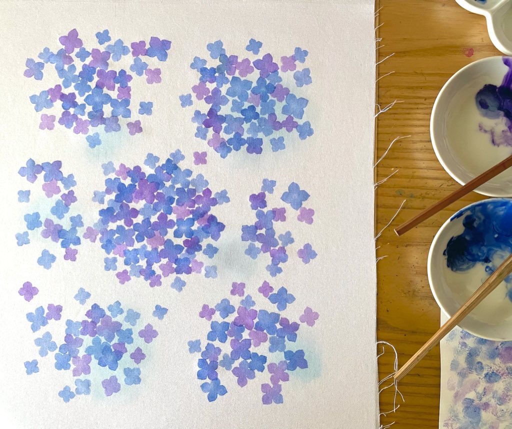 #ゴールデンウィークSNS展覧会2023 布に手描きで染めて制作してます。 6/8〜6/12、三軒茶屋LUPOPOさんで個展を開催します! @Lupopo_cafe 型染めパネルとハンカチを並べる予定です!紫陽花、染まりました💠✨