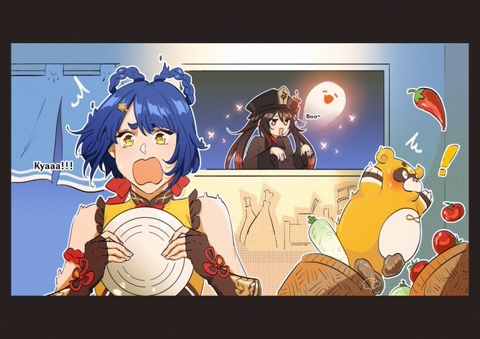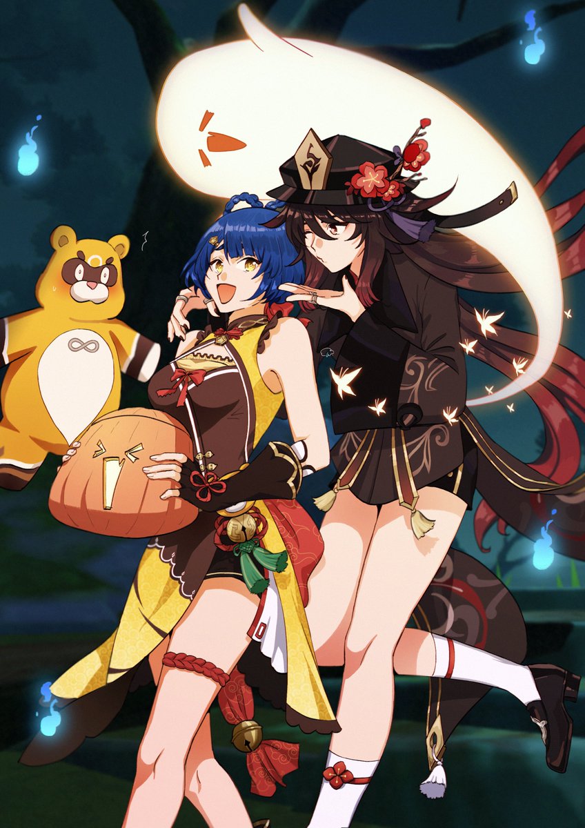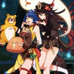 Halloween is just a reason for me to annually draw Xiangling & Hu Tao together. 👻🦋🐻🎃 #原神 #GenshinImpact #Xiangling #HuTao #Guoba #taoling